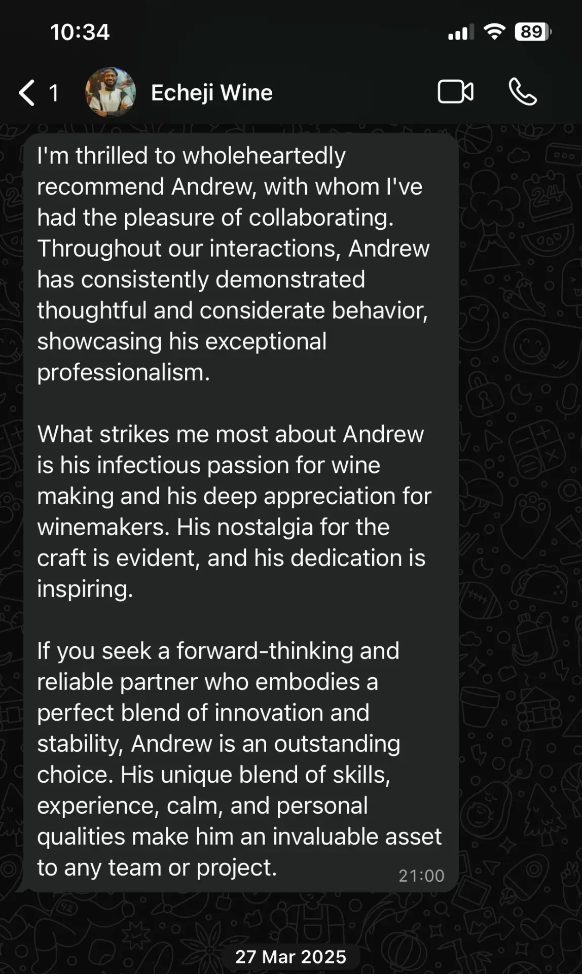 I began my career at Coca-Cola, managing the quality of products like Coke, Fanta and Sprite. Later I founded a wine company called Avaland Winery, where I developed Avaland sweet red wine and Avaland Gold Edition and went on to create Cheza Uganda’s first sparkling wine brand.